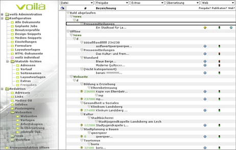 The voilà browser editor allows you as author, editor or editor in chief to structure your web page, create and edit all texts as well as edit your work via modern Internet browsers. The documents in the overview are shown dynamically depending on the navigational area you wish to edit. Editing functions are available in context-sensitive navigation bars and function icons.